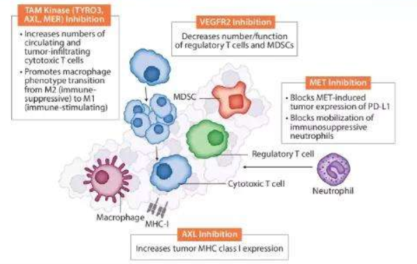 卡博替尼不仅能够同时阻断VEGF和HGF/MET通路,它还对AXL基因有抑制作用,从而抑制血管生成,对肿瘤细胞有直接促进凋亡的作用。综上,卡博替尼对VEGFR、MET、AXL的多重抑制使得其能够更加有效地抑制肿瘤细胞的增殖与扩散,并且对比一些传统血管内皮生长因子受体抑制剂,如舒尼替尼,使用卡博替尼治疗的肿瘤出现耐药性会更加缓慢。