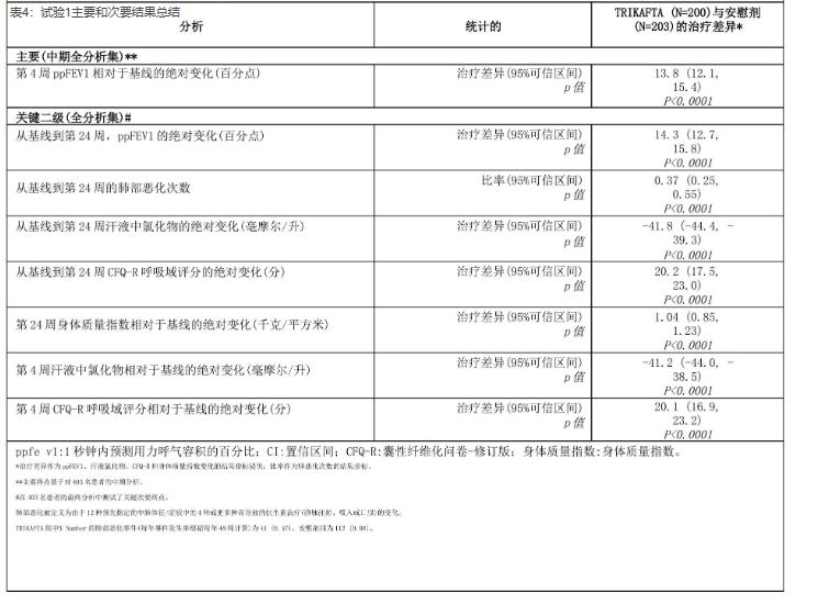 在接受试验的403名患者中,第4周的ppFEV1相对于基线的平均绝对出现变化,kaftrio和安慰剂之间的治疗差异为13.8%,从基线到第24周,kaftrio和安慰剂之间的ppFEV1平均绝对变化的治疗差异为14.3%。综合来看,无论年龄、基线ppFEV1、性别和地理区域如何,均观察到ppFEV1的改善,试验1中主要和次要结果的总结见表4。