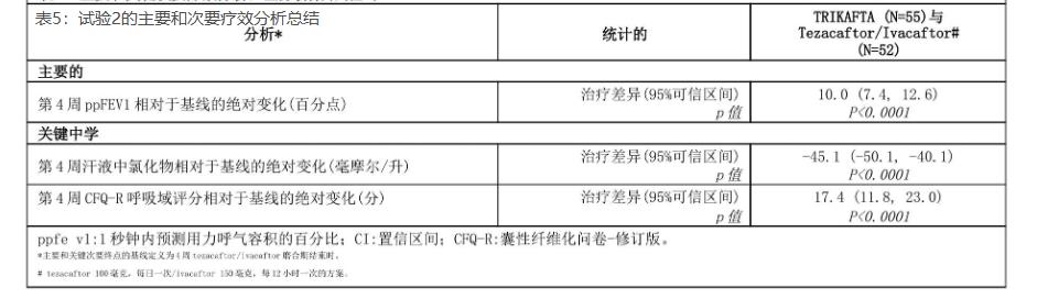 与使用tezacaftor/ivacaftor相比,使用kaftrio治疗的患者的ppFEV1改善10.0%,具有统计学显著性。在试验第15天时第一次评估中观察到ppFEV1平均改善。无论龄、性别、基线ppFEV1和地理区域如何,均观察到患者用药后ppFEV1的改善,主要和次要结果汇总见表5。