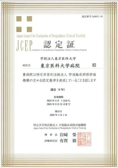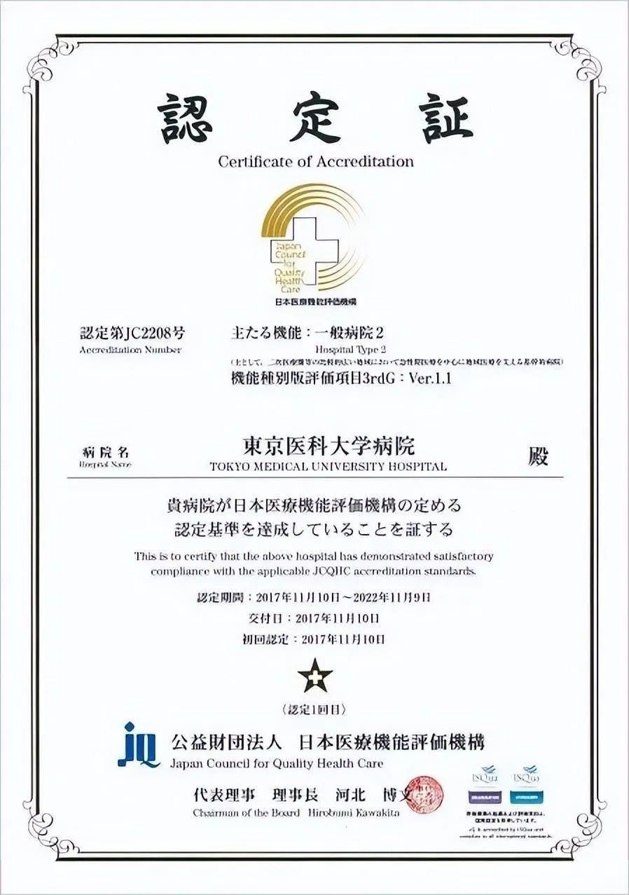 经过严格审核,东京医科大学医院获得日本医疗功能评价机构认定的医院功能评价认定证资格,并且被日本政府指定认证机构“MEJ”认定为Japan International Hospitals(日本国际医院)。