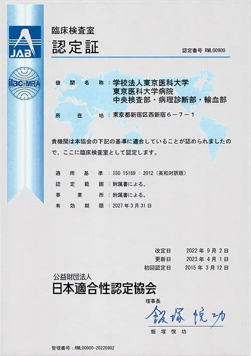 东京医科大学医院的中央检验部、病理诊断部及输血部已成功通过审核,获得ISO15189:2012《医学实验室—质量和能力的要求》国际标准认证(认证编号:RML00900)。此项认证体现了医院对提供高质量临床实验室服务的坚定承诺,并验证了其符合国际标准的专业技术水平与管理能力。ISO15189是由国际标准化组织(ISO)发布的专门针对医学实验室质量与能力要求的国际规范,涵盖“质量管理体系要求”与“根据实验室检验类型所需的技术能力要求”两大核心部分。获得该认证的实验室,其出具的检验结果在国际范围内具有广泛的互通性与认可度。