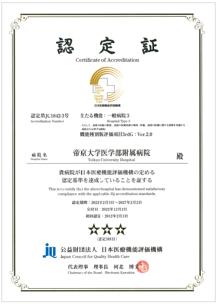 截至2022年12月2日,本院已被日本医疗保健功能评估机构认证为“医院功能评估综合医院3<3rdG:Ver.2.0>”。
