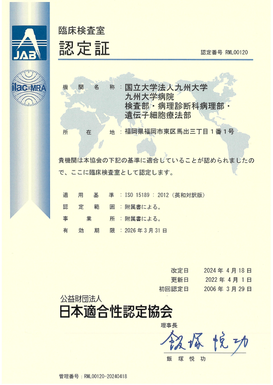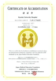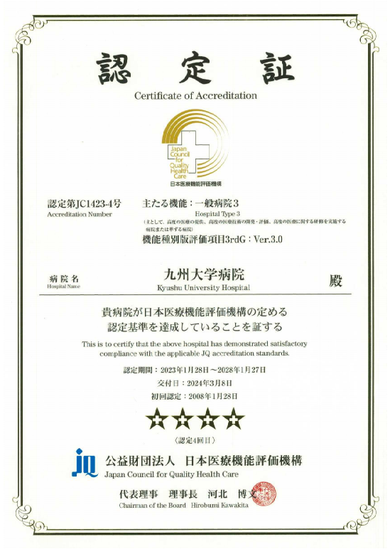 九州大学医院于2018年10月接受了日本质量保健委员会根据其医院认证标准Hospital Type3 3rdG Version 2.0进行的第三方评估,并于2019年4月5日获得认证。