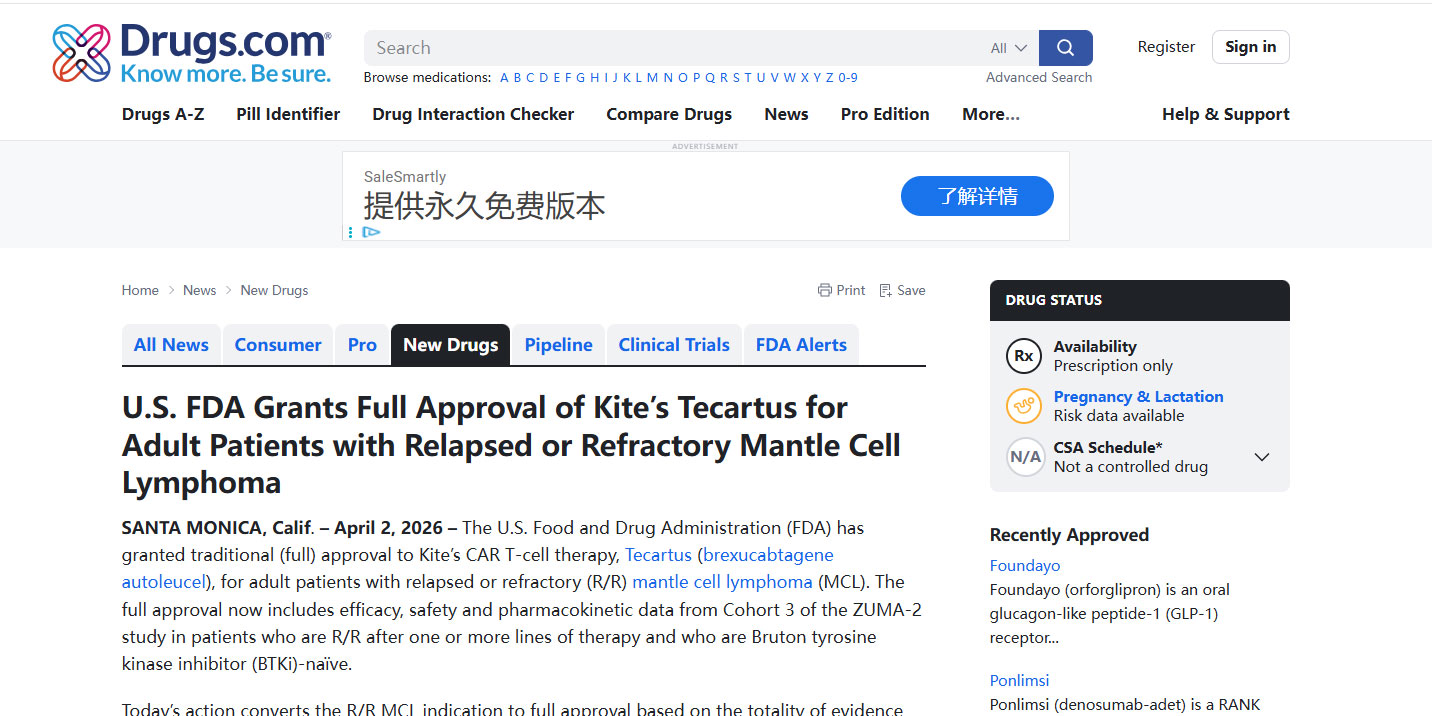 美国FDA完全批准Kite公司Tecartus用于成人复发或难治性套细胞淋巴瘤