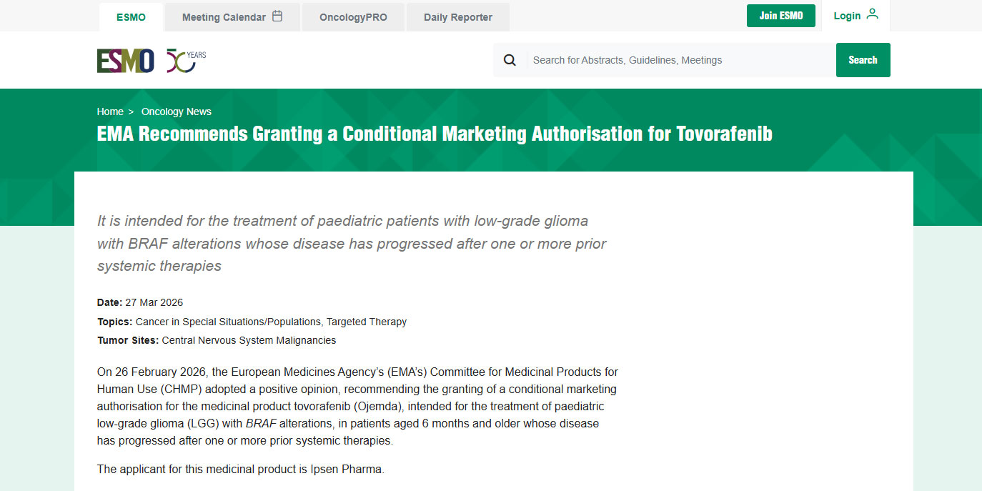 EMA建议授予托沃拉非尼(Tovorafenib)有条件上市许可,用于治疗既往经治后疾病进展的BRAF改变儿童低级别胶质瘤