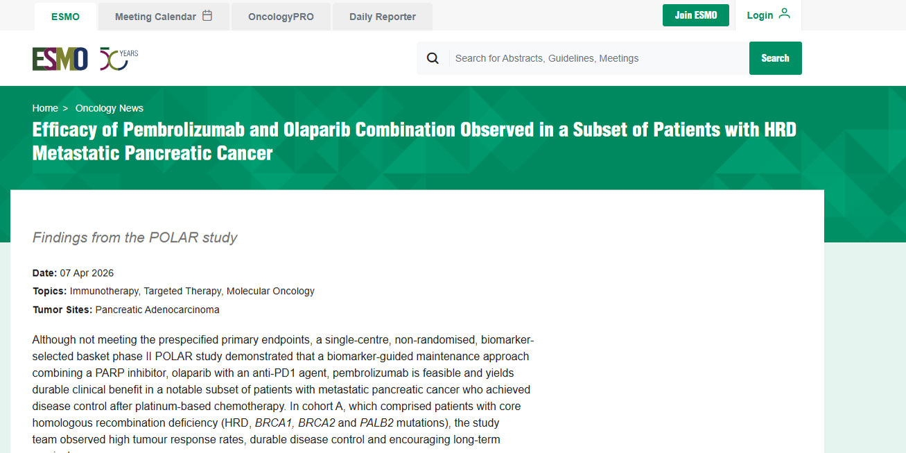 帕博利珠单抗联合奥拉帕利在部分HRD转移性胰腺癌患者中观察到疗效