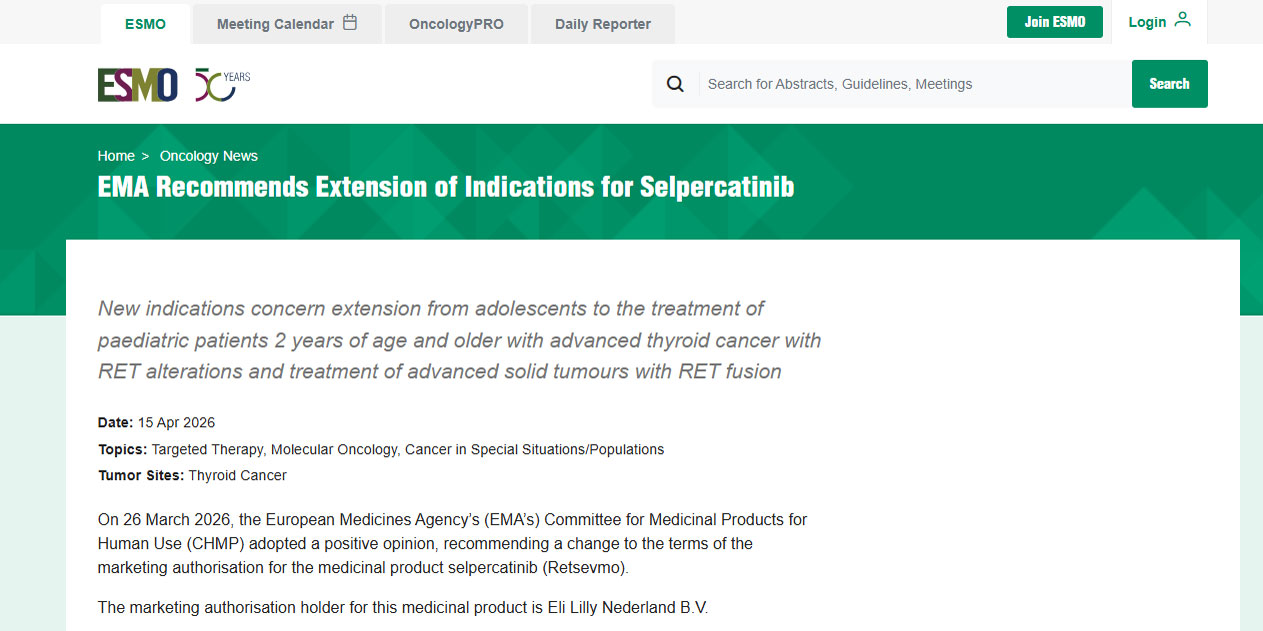 EMA建议扩展Selpercatinib适应症,新适应症包括扩展至2岁及以上RET突变晚期甲状腺癌儿科患者以及RET融合晚期实体瘤治疗