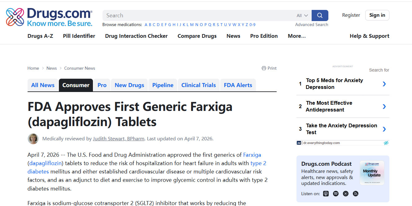 FDA批准首个达格列净(Farxiga)片剂仿制药