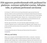 美国FDA批准帕博利珠单抗联合紫杉醇用于治疗铂耐药上皮性卵巢癌、输卵管癌或原发性腹膜癌