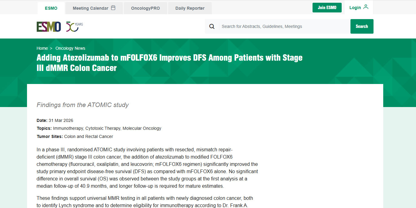阿替利珠单抗联合mFOLFOX6改善III期dMMR结肠癌患者的无病生存期