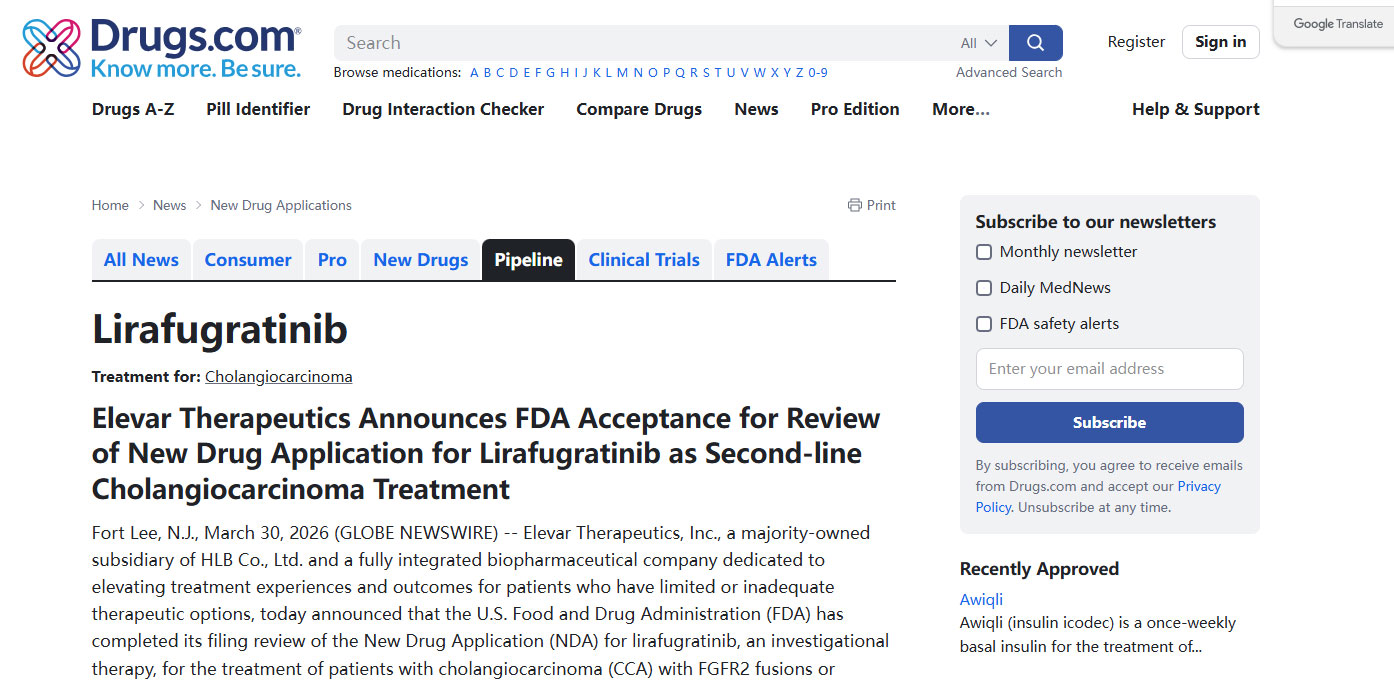 ElevarTherapeutics宣布FDA受理利拉夫替尼(Lirafugratinib)作为胆管癌二线治疗的新药申请