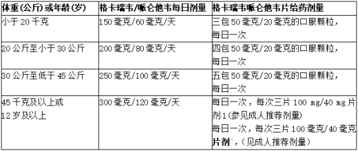 体重<20kg:每日剂量为格卡瑞韦150mg/哌仑他韦60mg,即每日3包50mg/20mg的口服丸。