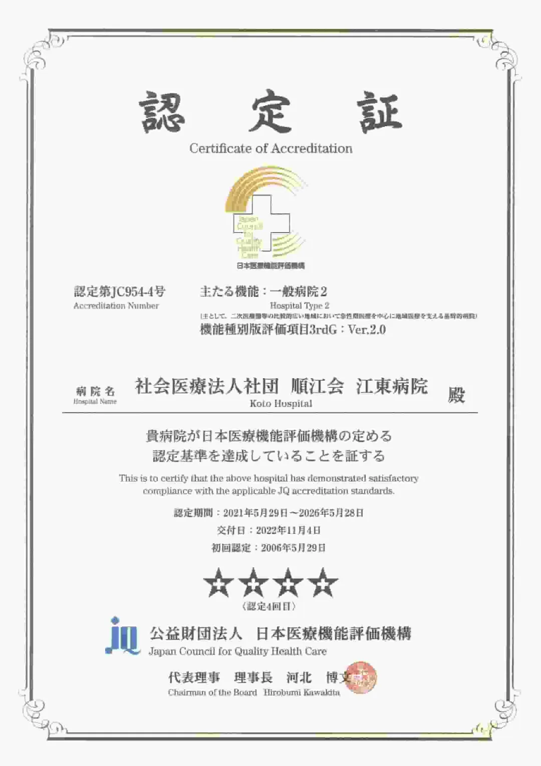 评估调查者站在中立公平的立场上,按照规定的评估项目评估医院的活动情况。针对评价结果明确的课题,医院将致力于改善,从而提高医疗质量。